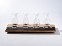 Indulge in an evening of wine tasting with this elegant Wine Flight set. This set includes four 7.44 oz. glass carafes, and a lightweight but sturdy wooden flight board so that you can transport and enjoy your wines with ease.